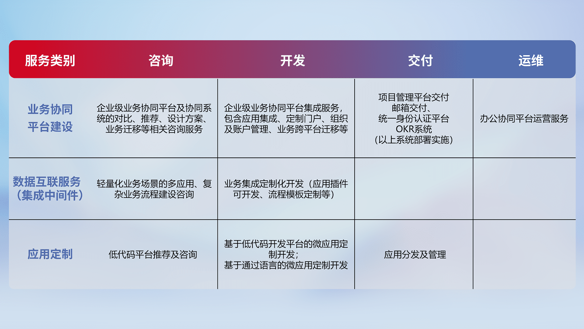 针对钉钉、、、企微、、、IDaas等平台级产品提供产品的规划、、、、方案、、、交付、、、定制化开发等服务,,,,实现如统一协同办公、、智能客户服务、、混合会议管理、、、、智能数据查询、、、、等业务场景,,,实现数字化转型。。。。
